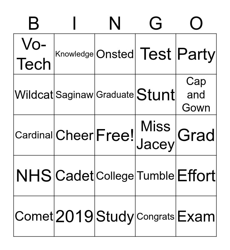 This bingo card has a free space and 29 words: Comet, Flyer, Cheer, Senior, Vo-Tech, Onsted, Saginaw, Cadet, Miss Jacey, 2019, Grad, Exam, Study, Congrats, Cap and Gown, Diploma, College, NHS, Party, Cardinal, Tumble, Move, Stunt, Wildcat, Test, Knowledge, Effort, Graduate and Celebrate.