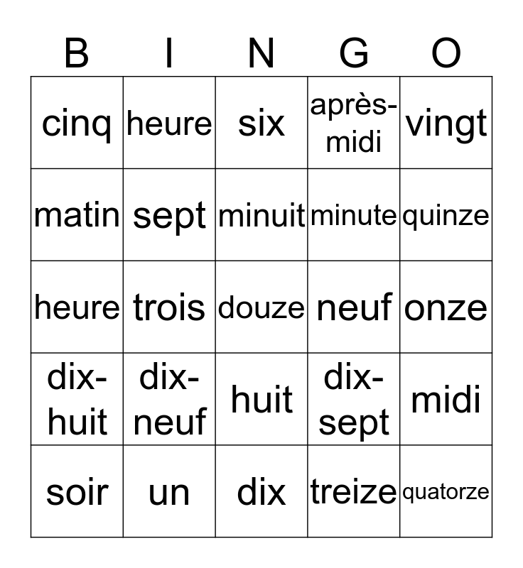 This bingo card has 30 words: un, deux, trois, quatre, cinq, six, sept, huit, neuf, dix, onze, douze, treize, quatorze, quinze, seize, dix-sept, dix-huit, dix-neuf, vingt, heure, horloge, heure, minute, matin, après-midi, midi, soir, minuit and french.
