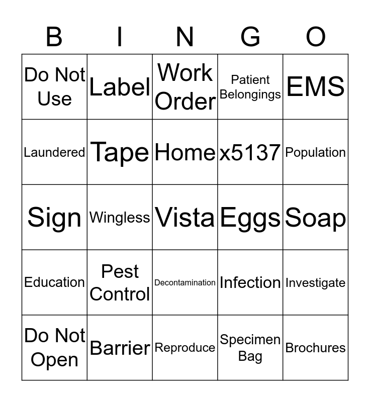 This bingo card has a free space and 29 words: Do Not Open, Shower, Wingless, Terminal Cleaning, Do Not Use, Work Order, Tape, Pest Control, Eggs, Barrier, Soap, Brochures, Reproduce, Specimen Bag, Population, Plastic Sheet, Decontamination, Education, EMS, Sign, Infection, Private Room, x5137, Laundered, Patient Belongings, Label, Investigate, Home and Family.