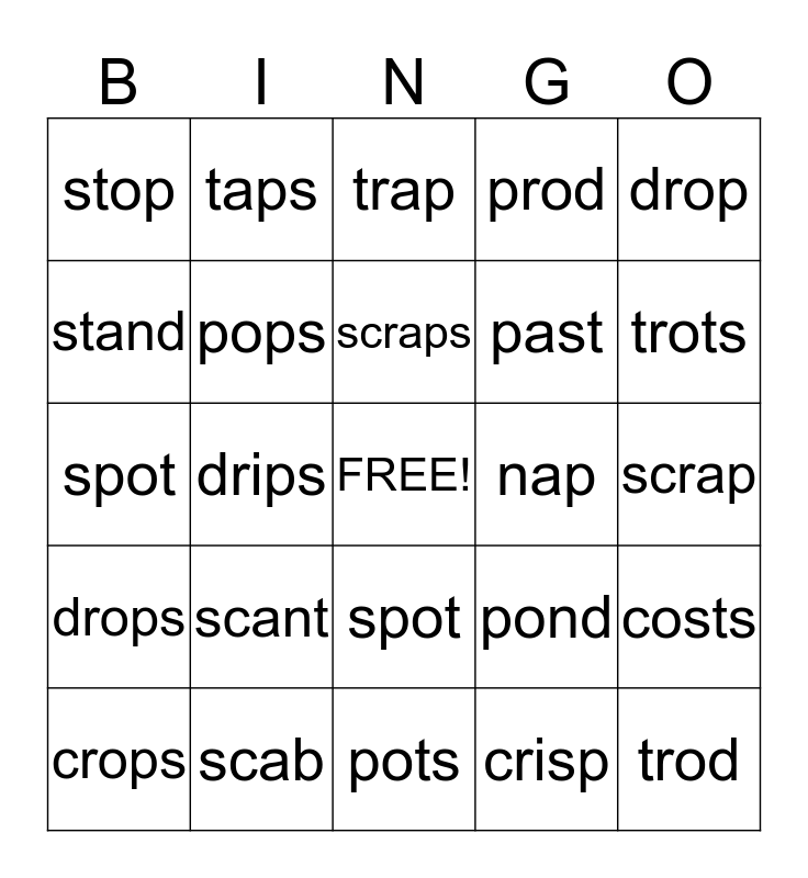 This bingo card has a free space and 24 words: scant, scab, scraps, crops, drop, stop, stand, taps, nap, spot, past, spot, pond, costs, pops, crisp, scrap, trap, trots, drips, trod, drops, prod and pots.