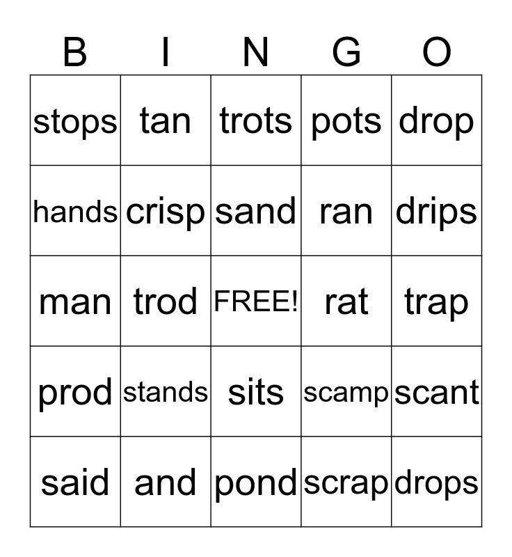 This bingo card has a free space and 24 words: stands, and, sand, said, drop, stops, hands, tan, rat, sits, ran, man, scamp, scant, crisp, scrap, trap, trots, drips, trod, drops, prod, pots and pond.