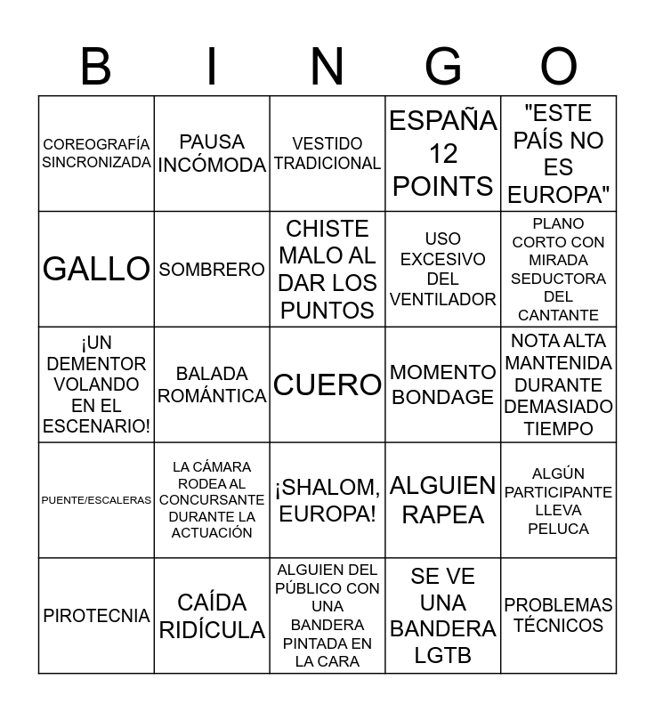 This bingo card has 57 words: Free!, PIROTECNIA, TORMENTA EN EL ESCENARIO/ALTERACIÓN METEOROLÓGICA, COREOGRAFÍA SINCRONIZADA, ALGUIEN DEL PÚBLICO CON UNA BANDERA PINTADA EN LA CARA, PLUMAS/ALAS, SOMBRERO, DARLE LAS GRACIAS AL PAÍS ANFITRIÓN POR UNA TARDE MARAVILLOSA, USO EXCESIVO DEL VENTILADOR, ALGO VA MAL, ESPAÑA 12 POINTS, CAÑÓN DE PURPURINA, PROTESTA POLÍTICA, LÁGRIMAS DE FELICIDAD, CAMBIO EXPRÉS DE VESTUARIO SOBRE EL ESCENARIO, CAMBIO DE OUTFIT DEL PRESENTADOR, "ESTE PAÍS NO ES EUROPA", BALADA ROMÁNTICA, LENTEJUELAS/BRILLIBRILLI, CUERO, MOMENTO BONDAGE, SILBIDOS, ALGUIEN RAPEA, VESTIDO TRADICIONAL, 12 PUNTOS AL VECINO, CHISTE MALO AL DAR LOS PUNTOS, "ESTE SE ESTÁ ALARGANDO DANDO LOS PUNTOS", MÁQUINA DE HUMO, PLANO CORTO CON MIRADA SEDUCTORA DEL CANTANTE, GUIÑO A CÁMARA, COROS ÉPICOS, BAILARÍN HUELEPELOS, "LOS PAÍSES DEL ESTE SE VOTAN ENTRE ELLOS", "¿POR QUÉ ESTÁ AUSTRALIA EN EUROVISIÓN?", NOTA ALTA MANTENIDA DURANTE DEMASIADO TIEMPO, GALLO, CANCIÓN EN DOS IDIOMAS, ¡UN DEMENTOR VOLANDO EN EL ESCENARIO!, PINCHOS DE METAL/HOMBRERAS, PUENTE/ESCALERAS, PAUSA INCÓMODA, ¡SHALOM, EUROPA!, PROBLEMAS TÉCNICOS, PARTICIPANTE CON EL PELO DE COLOR, LA ANFITRONIA LLEVA UN VESTIDO ROSA, EN EL VÍDEO DE INTRODUCCIÓN DE UN PAÍS APARECE UNA MONTAÑA, LA CÁMARA RODEA AL CONCURSANTE DURANTE LA ACTUACIÓN, CAÍDA RIDÍCULA, HIELO SECO, ACROBACIAS, NO SABES LOCALIZAR EN UN MAPA EL PAÍS QUE ESTÁ ACTUANDO, SE VE UNA BANDERA LGTB, "EUROVISIÓN ES TODO POLÍTICA", POCA ROPA, EL QUE DA LOS PUNTOS SE PONE A CANTAR, ALGÚN PARTICIPANTE LLEVA PELUCA and DIVA GAY.