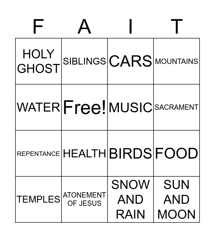 This bingo card has 51 words: Jesus Christ, TEMPLES, PRIESTHOOD, BOOK OF MORMON, BIBLE, PARENTS, SIBLINGS, PROPHETS, Free!, GENERAL CONFERENCE, MUSIC, MOUNTAINS, ANIMALS, BODIES, SCHOOLS, TEACHERS, SACRAMENT, ATONEMENT OF JESUS, TECHNOLOGY, WATER, FOOD, GOOD BOOKS, HOLY GHOST, REPENTANCE, CLOTHING, PEACE, HEALTH, ELECTRICITY, INTERNET, CARS, PLANES, DOCTORS, MEDICAL PROCEDURES, MEDICINES, DENTISTS, GLASSES, NATURAL GAS, FORGIVENESS, AMERICA, FREEDOM, SNOW AND RAIN, SUN AND MOON, WRITTEN LANGUAGE, TREES, FISH, FRIENDS, BIRDS, INSECTS, BAPTISM, CHURCH BUILDINGS and RESTORED GOSPEL.