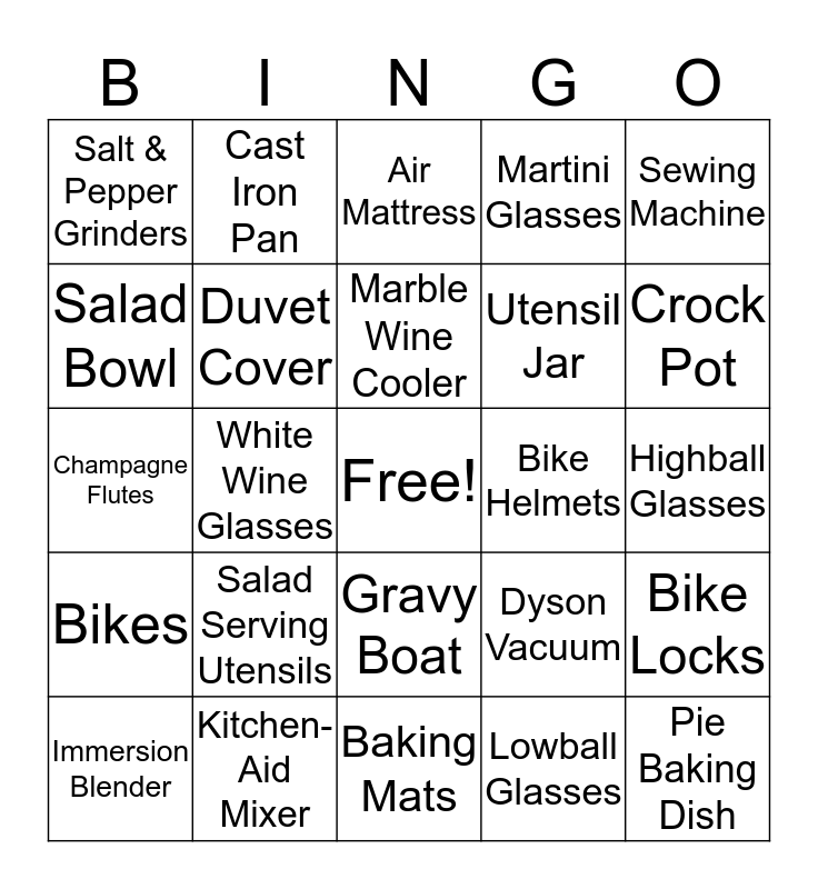 This bingo card has a free space and 27 words: Dyson Vacuum, Tent, Utensil Jar, Baking Mats, Salad Bowl, Air Mattress, Cast Iron Pan, Bikes, Bike Helmets, Bike Locks, Champagne Flutes, Martini Glasses, Immersion Blender, Kitchen-Aid Mixer, Crock Pot, Glass Tupperware, Duvet Cover, Marble Wine Cooler, Salad Serving Utensils, Salt & Pepper Grinders, Highball Glasses, Lowball Glasses, White Wine Glasses, Pie Baking Dish, Gravy Boat, Sewing Machine and Cake Stand.