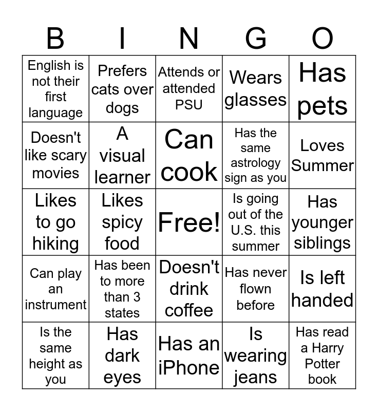 This bingo card has a free space and 24 words: Has been to more than 3 states, Has dark eyes, Can cook, Is the same height as you, Has pets, English is not their first language, Doesn't like scary movies, Prefers cats over dogs, Is going out of the U.S. this summer, Doesn't drink coffee, Has the same astrology sign as you, Likes to go hiking, Has never flown before, Is left handed, A visual learner, Is wearing jeans, Has younger siblings, Attends or attended PSU, Loves Summer, Likes spicy food, Has read a Harry Potter book, Can play an instrument, Wears glasses and Has an iPhone.