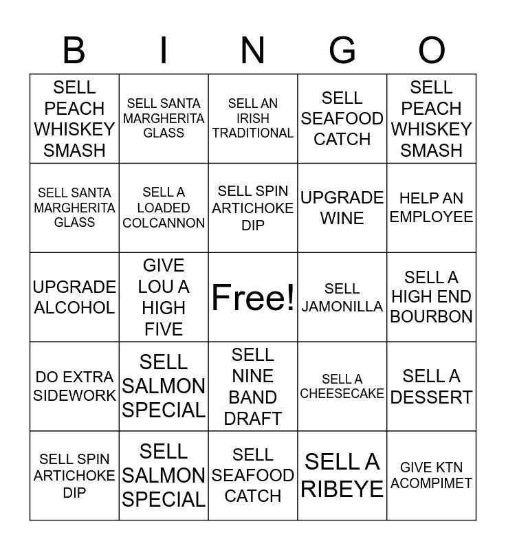 This bingo card has a free space and 24 words: SELL SALMON SPECIAL, SELL SALMON SPECIAL, SELL SPIN ARTICHOKE DIP, SELL SPIN ARTICHOKE DIP, SELL PEACH WHISKEY SMASH, SELL PEACH WHISKEY SMASH, SELL SANTA MARGHERITA GLASS, SELL SANTA MARGHERITA GLASS, SELL JAMONILLA, SELL NINE BAND DRAFT, UPGRADE WINE, UPGRADE ALCOHOL, SELL A CHEESECAKE, SELL A DESSERT, SELL A LOADED COLCANNON, SELL A RIBEYE, SELL A HIGH END BOURBON, SELL AN IRISH TRADITIONAL, HELP AN EMPLOYEE, GIVE LOU A HIGH FIVE, GIVE KTN ACOMPIMET, DO EXTRA SIDEWORK, SELL SEAFOOD CATCH and SELL SEAFOOD CATCH.