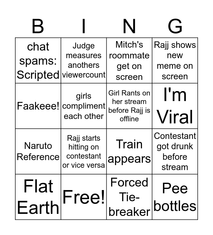 This bingo card has 24 words: Mira Mentioned, Getting Pegged, I'm Viral, Good one ...., Faakeee!, chat spams: Scripted, girls compliment each other, Judge measures anothers viewercount, Free!, Instagram model btw, Naruto Reference, Train appears, Someone gets muted, Tech issues, Girl Rants on her stream before Rajj is offline, (Former) Camgirl, Forced Tie- breaker, Mitch's roommate get on screen, Rajj starts hitting on contestant or vice versa, Contestant got drunk before stream, Flat Earth, Pee bottles, Rajj shows new meme on screen and Trap card activated.