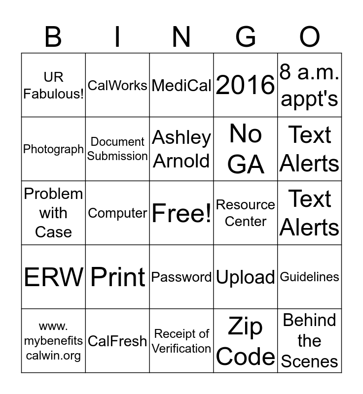 This bingo card has a free space and 30 words: CalFresh, Intake, Computer, Forms, UR Fabulous!, MediCal, Document Submission, Password, Resource Center, Receipt of Verification, Text Alerts, Behind the Scenes, Zip Code, Form Not Received or In-complete, Text Alerts, FileNet, Upload, ERW, Print, 8 a.m. appt's, Problem with Case, Electronic Signature, CalWorks, No GA, Photograph, 2016, Guidelines, www. mybenefits calwin.org, Ashley Arnold and email.