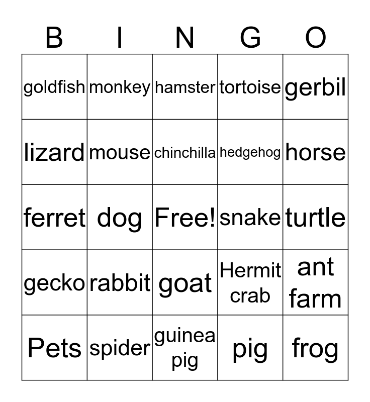 This bingo card has a free space and 29 words: Pets, cat, dog, bird, goldfish, hamster, mouse, rabbit, snake, spider, turtle, frog, guinea pig, pig, horse, llama, goat, gecko, gerbil, ferret, Hermit crab, sheep, hedgehog, lizard, tortoise, monkey, ant farm, chinchilla and donkey.
