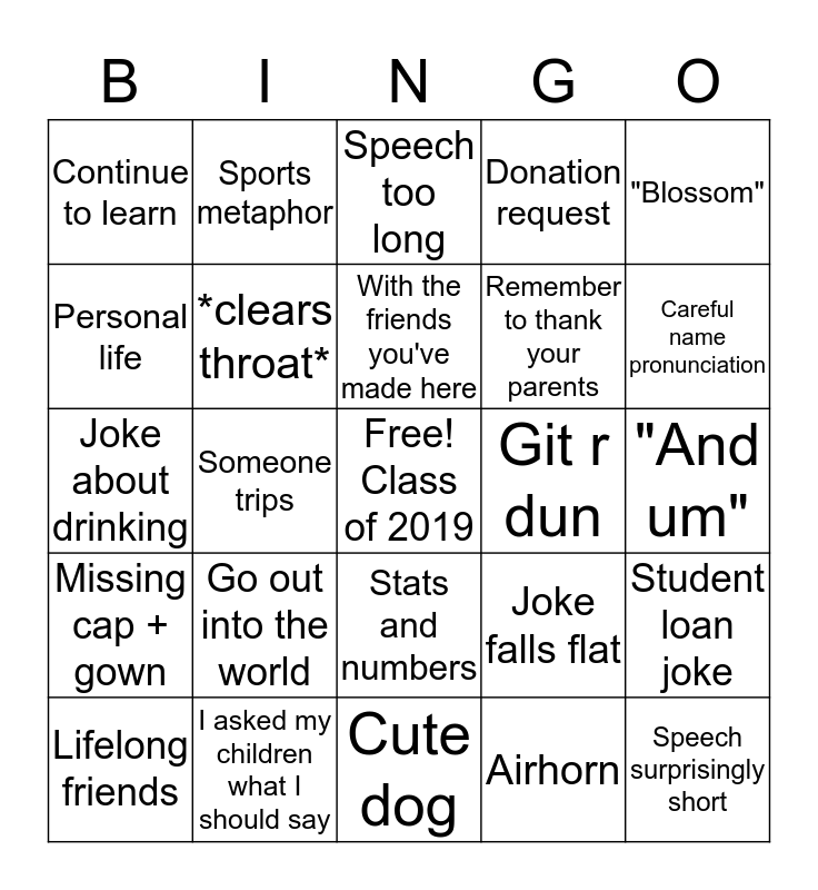 This bingo card has a free space and 24 words: Go out into the world, I asked my children what I should say, With the friends you've made here, Lifelong friends, "Blossom", Continue to learn, Personal life, Sports metaphor, Git r dun, Stats and numbers, Remember to thank your parents, Joke about drinking, Joke falls flat, Student loan joke, *clears throat*, Airhorn, "And um", Speech too long, Careful name pronunciation, Someone trips, Speech surprisingly short, Missing cap + gown, Donation request and Cute dog.