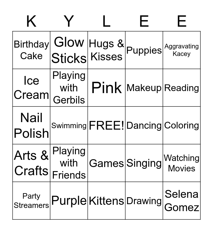 This bingo card has a free space and 24 words: Playing with Friends, Purple, Pink, Party Streamers, Aggravating Kacey, Birthday Cake, Ice Cream, Glow Sticks, Dancing, Games, Makeup, Nail Polish, Singing, Watching Movies, Playing with Gerbils, Drawing, Coloring, Hugs & Kisses, Reading, Swimming, Selena Gomez, Arts & Crafts, Puppies and Kittens.