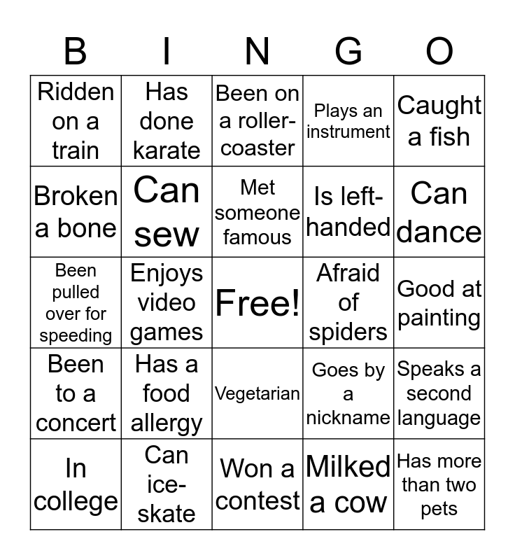 This bingo card has a free space and 49 words: Been to Europe, Has more than two pets, Been to Disney world, Won a contest, Has a food allergy, Has never been on a plane, Has done karate, Has been on stage, Broken a bone, Can rollerskate, Can sew, Plays an instrument, Speaks a second language, Goes by a nickname, Good at math, Lived in more than two states, Met someone famous, Afraid of spiders, Born in January, Caught a fish, Enjoys video games, Milked a cow, Ridden on a train, Is left-handed, Doesn't like pizza, Can dance, In college, Has kids, Vegetarian, Been to a concert, Been scuba-diving, Been in a helicopter, Ridden in a police car, Fell out of a tree, Can ice-skate, Taught a class, Run a marathon, Keeps a diary, Good at painting, Has grand- children, Likes gardening, Touched a snake, Sung for an audience, Married, Been pulled over for speeding, Been on a roller- coaster, Been to Africa, Been to Asia and Been to South America.