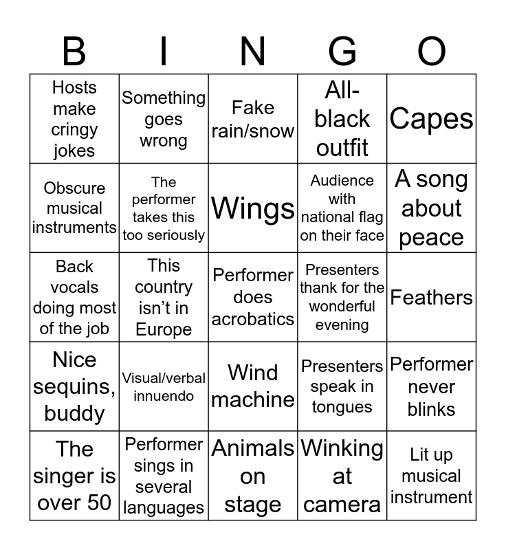 This bingo card has 69 words: Free!, Feathers, And there’s the key change, Performer sings in native language, Performer sings in several languages, All-white outfit, All-black outfit, Unique setup (never done before), Capes, The main singer never moves, Performer never blinks, Hosts change outfits, Hosts make cringy jokes, Fake rain/snow, FIRE/Fireworks, This country isn’t in Europe, Wind machine, Audience with national flag on their face, A song about love, Nice sequins, buddy, Presenters thank for the wonderful evening, Presenters speak in tongues, A song about peace, Hey! You performed before, Happy tears, Contestant out of tune, Obviously fake instrument playing, Traditional dress, Winking at camera, Mid-song costume change, Something goes wrong, Twelve points to a neighbour, Synchronized dance routine, Presenter’s joke falls flat, “Thank you, Europe!”, Grammatically-incorrect English, A former Eurovision star is the jury spokesperson, Someone references the gays, Obscure musical instruments, Lit up musical instrument, Visual/verbal innuendo, Performer does acrobatics, A power ballad, Opera, “Hello, Europe!”, The singer is over 50, Outrageous cleavage, Smoke machines are GO!, The crowd boos, The performer takes this too seriously, Wings, The performer is under 18, Sounds like it’s from the wrong decade, Animals on stage, Politically charge lyrics, Hosts tell an actually funny joke, Rapping, Gimmicks, Holding a note way too long, Back vocals doing most of the job, 3 English words in otherwise native lyrics, BDSM, The black sheep, Is that a …??!, 3+ genres in one song, Epilepsy-inducing lights, Power pose, My knees gave out and Welcome to the 74th annual hunger games!.
