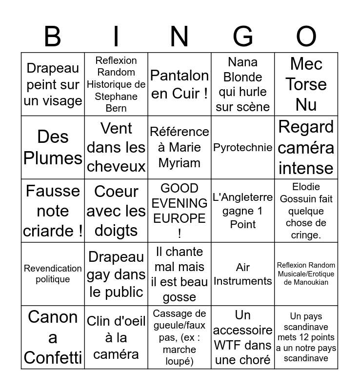 This bingo card has a free space and 24 words: Drapeau gay dans le public, Clin d'oeil à la caméra, Référence à Marie Myriam, Canon a Confetti, Mec Torse Nu, Drapeau peint sur un visage, Des Plumes, Reflexion Random Historique de Stephane Bern, L'Angleterre gagne 1 Point, Il chante mal mais il est beau gosse, Pyrotechnie, Fausse note criarde !, Air Instruments, Reflexion Random Musicale/Erotique de Manoukian, Vent dans les cheveux, Un accessoire WTF dans une choré, Elodie Gossuin fait quelque chose de cringe., Pantalon en Cuir !, Regard caméra intense, Coeur avec les doigts, Un pays scandinave mets 12 points a un notre pays scandinave, Revendication politique, Nana Blonde qui hurle sur scène and Cassage de gueule/faux pas, (ex : marche loupé).