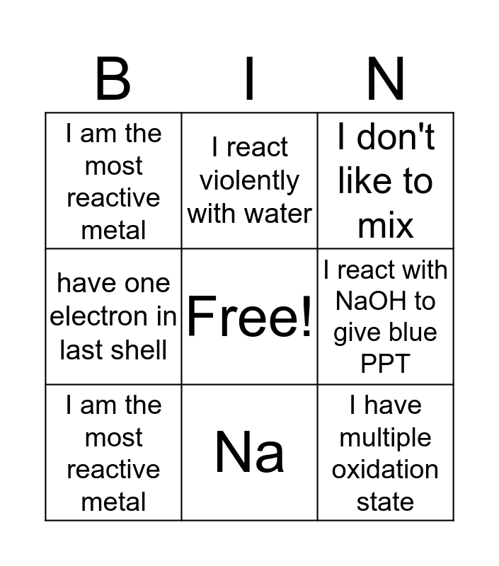 This bingo card has a free space and 14 words: I am the most reactive metal, I burn with lilac flame, I am pale green gas, I am the most reactive metal, I have multiple oxidation state, I react violently with water, Ar, I am the only liquid nonmetal, I am used as a catalyst, I don't like to mix, have one electron in last shell, Na, I react with NaOH to give blue PPT and I am the lightest element.