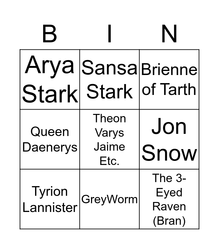 This bingo card has a free space and 8 words: Jon Snow, Brienne of Tarth, Sansa Stark, Tyrion Lannister, Arya Stark, The 3-Eyed Raven (Bran), Queen Daenerys and GreyWorm.