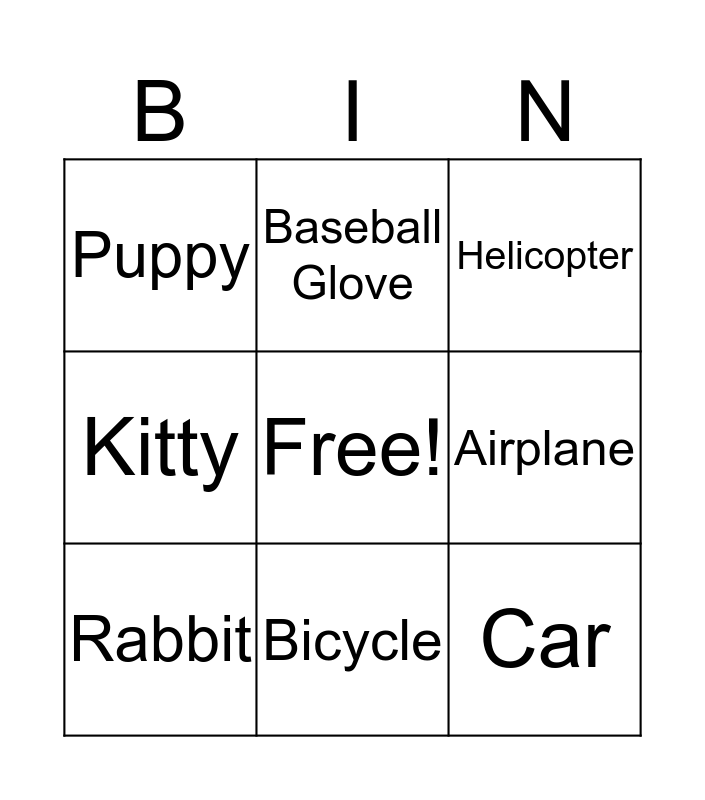 This bingo card has a free space and 8 words: Airplane, Helicopter, Baseball Glove, Rabbit, Puppy, Car, Kitty and Bicycle.