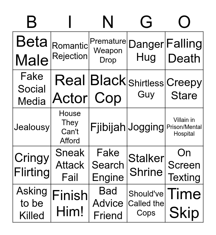 This bingo card has a free space and 56 words: Wine, Asking to be Killed, Actor From Another Lifetime Move, Beta Male, Bad Advice Friend, Hidden Camera, Real Actor, Motive Rant, Shirtless Guy, Cat Scare, Danger Hug, Flashback, Black Hoodie, Spying From Car, Dream or Fantasy Sequence, Canadian Accent, Falling Death, House They Can't Afford, Snooping, Time Skip, Jogging, "Hot Guy" Stubble, Stalker Shrine, Premature Weapon Drop, White Cop, Black Cop, Female Cop, Police are Useless, Creepy Stare, Poor Escape Route, "Artistic" Filmmaking, Mishandled Gun, Bad Parenting, Vapid Conversation, Villain in Prison/Mental Hospital, Fake Social Media, Jealousy, Cleavage, Cringy Flirting, Romantic Rejection, Fake Search Engine, "Hacking", Insert Song, Frame Job, REEEEEEEEEEEEEE!, Sneak Attack Fail, Finish Him!, Male Appeal Moment, Sexism, Hero Does Something Deplorable, Should've Called the Cops, Hero isn't Believed, Anonymous Harassment, Unlocked Phone/Laptop, On Screen Texting and Dead/Absent Father/Husband.