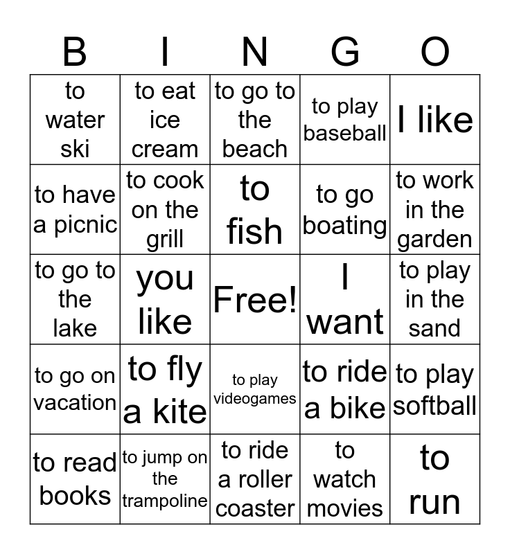 This bingo card has a free space and 46 words: to swim, to run, to take a walk, to ride a roller coaster, to fly a kite, to catch fireflies, to eat ice cream, to eat popsicles, to have a picnic, to draw with chalk, to cook on the grill, to play baseball, to play softball, to ride a bike, to camp, to shoot off fireworks, to fish, I want, you want, I like, you like, to watch movies, to water ski, to go boating, to mow the lawn, to work in the garden, to read books, to climb trees, to play videogames, to go on vacation, to blow bubbles, to have a garage sale, to play putt putt, to go to summer school, to play in the rain, to jump on the trampoline, to play in the sand, to play in the mud, to look at the stars, to hang out with friends, to sunbathe, to go to the beach, to go to the lake, to go to the pool, to sleep in a hammock and to go racing.