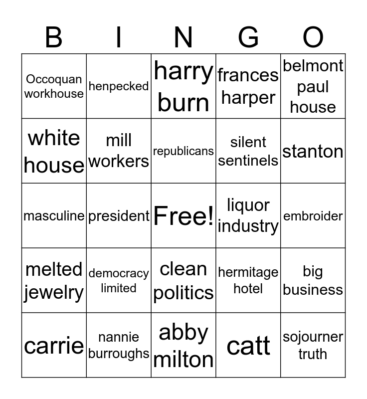 This bingo card has a free space and 64 words: Nashville, knoxville, memphis, big business, menace to the home, unpatriotic, henpecked, democrats, republicans, senators, clean politics, clean food, embroider, belmont paul house, pickett, white house, president, Occoquan workhouse, prison special, silent sentinels, democracy limited, melted jewelry, frances harper, anna cooper, Tennessee, suffrage, alice, paul, susan, anthony, lucretia, mott, elizabeth, cady, stanton, carrie, chapman, catt, seneca falls, mill workers, masculine, liquor industry, prohibition, anti-suffrage, Ida B Wells, sojourner truth, nannie burroughs, elizabeth ensley, hermitage hotel, special session, josephine pearson, anne dudley, abby milton, frankie pierce, lizzie crozier french, sue shelton white, harry burn, febb burn, declaration of sentiments, governor roberts, president woodrow wilson, voter registration, 36th state and equal rights amendment.