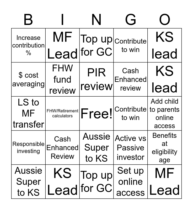 This bingo card has a free space and 24 words: Aussie Super to KS, Cash Enhanced Review, PIR review, Set up online access, KS lead, Increase contribution %, MF Lead, Top up for GC, Contribute to win, Add child to parents online access, LS to MF transfer, FHW fund review, Active vs Passive investor, Benefits at eligibility age, $ cost averaging, KS Lead, Top up for GC, Contribute to win, KS lead, Responsible investing, FHW/Retirement calculators, Aussie Super to KS, Cash Enhanced review and MF Lead.