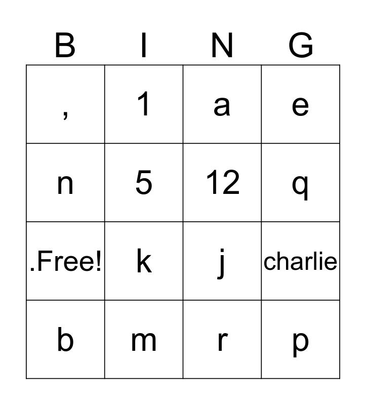 This bingo card has 20 words: charlie, nicon, a, q, b, n, m, ,, .Free!, 1, k, j, 5, p, 12, 18, q, e, r and t.