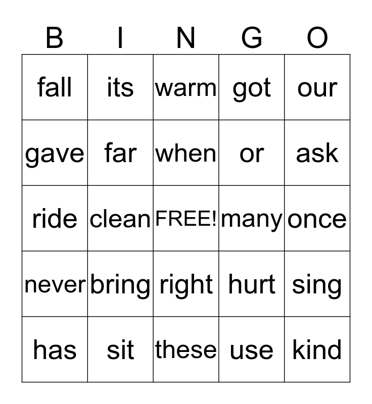 This bingo card has a free space and 24 words: bring, sit, when, has, our, fall, gave, its, many, right, or, ride, hurt, sing, far, use, once, warm, ask, clean, kind, never, got and these.