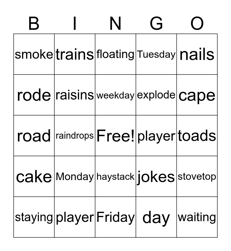 This bingo card has a free space and 24 words: Monday, player, weekday, staying, nails, smoke, rode, trains, player, haystack, explode, road, jokes, stovetop, raisins, day, toads, floating, cape, raindrops, waiting, cake, Tuesday and Friday.