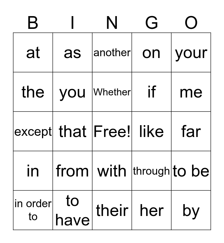 This bingo card has a free space and 24 words: from, to have, Whether, in order to, your, at, the, as, like, with, if, except, through, to be, you, her, far, another, me, that, by, in, on and their.