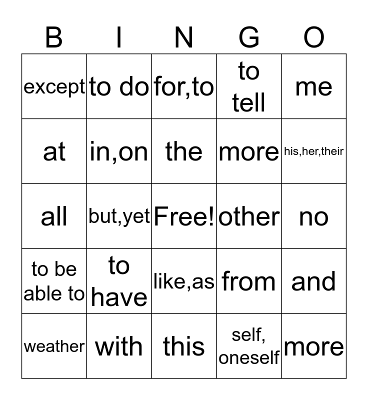 This bingo card has a free space and 24 words: to have, with, the, weather, me, except, at, to do, other, like,as, more, all, from, and, in,on, self, oneself, no, for,to, his,her,their, but,yet, more, to be able to, to tell and this.