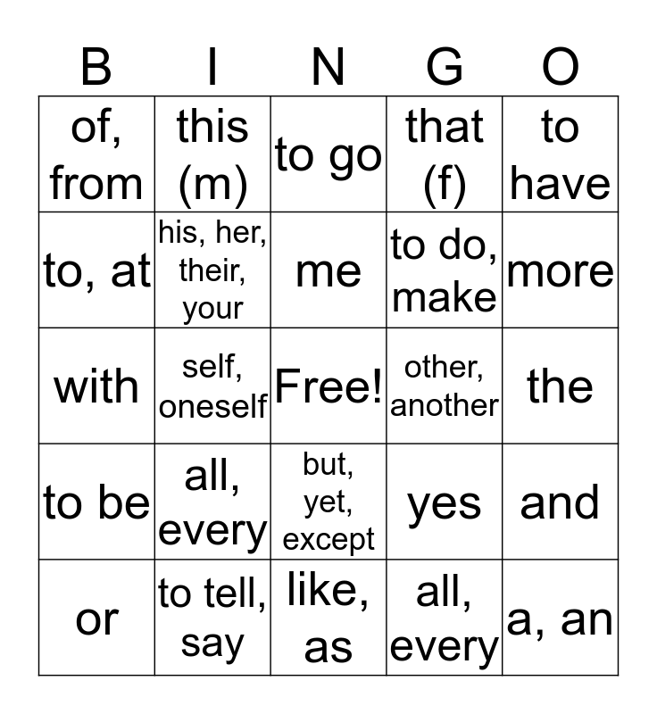 This bingo card has a free space and 24 words: all, every, to tell, say, me, or, to have, of, from, to, at, this (m), other, another, but, yet, except, to do, make, with, yes, and, his, her, their, your, all, every, the, to go, more, self, oneself, a, an, to be, that (f) and like, as.