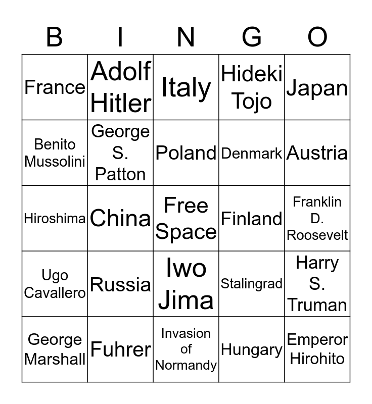 This bingo card has a free space and 24 words: Russia, Fuhrer, Poland, George Marshall, Japan, France, Benito Mussolini, Adolf Hitler, Finland, Iwo Jima, Denmark, Hiroshima, Stalingrad, Harry S. Truman, George S. Patton, Hungary, Franklin D. Roosevelt, Italy, Austria, China, Emperor Hirohito, Ugo Cavallero, Hideki Tojo and Invasion of Normandy.