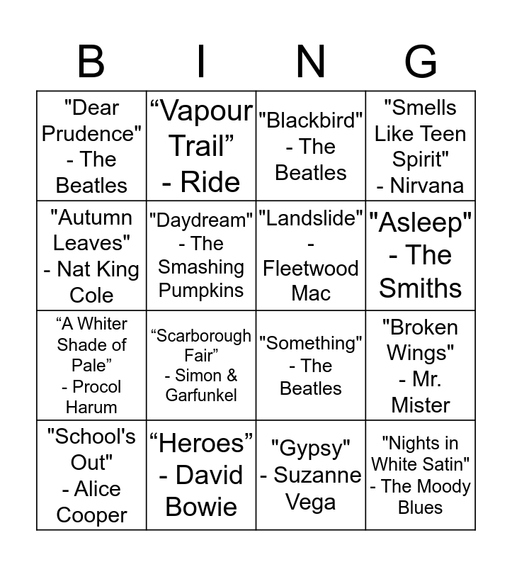 This bingo card has 21 words: “Heroes” - David Bowie, "Dusk" - Genesis, “Vapour Trail” - Ride, "MLK" -U2, "Gypsy" - Suzanne Vega, "Landslide" - Fleetwood Mac, "Dear Prudence" - The Beatles, "Blackbird" - The Beatles, "Something" - The Beatles, "Asleep" - The Smiths, “A Whiter Shade of Pale” - Procol Harum, "Smells Like Teen Spirit" - Nirvana, "Nights in White Satin" - The Moody Blues, "Where Eagles Dare" - The Misfits, "Daydream" - The Smashing Pumpkins, "Time of No Reply" - Nick Drake, "School's Out" - Alice Cooper, “Scarborough Fair” - Simon & Garfunkel, "Autumn Leaves" - Nat King Cole, "Broken Wings" - Mr. Mister and "I'm Going Home" - Tim Curry.