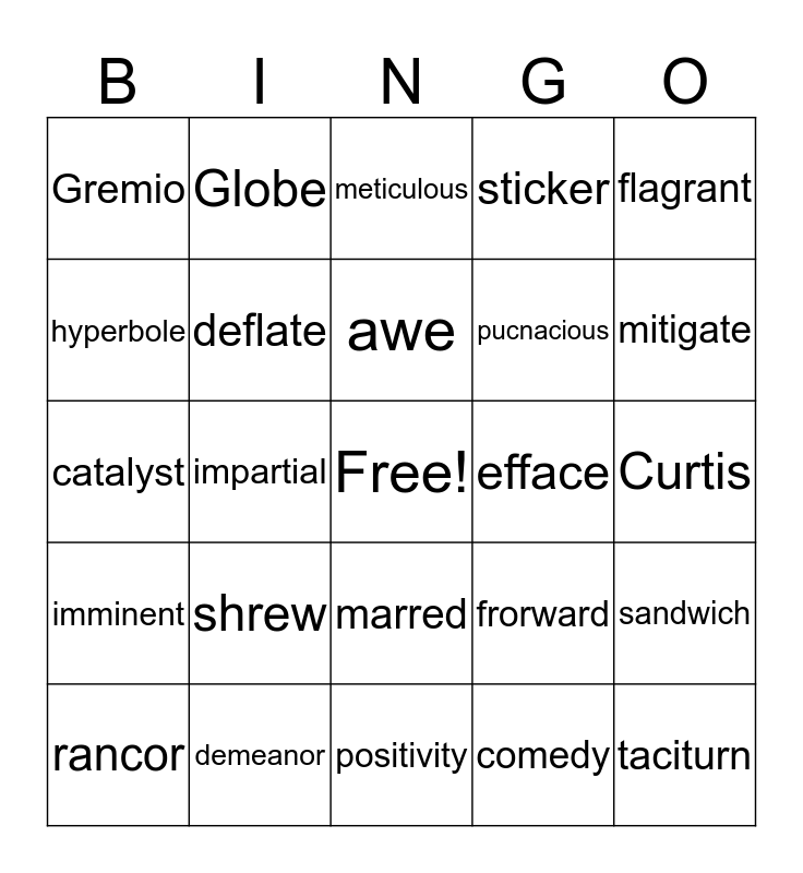 This bingo card has a free space and 29 words: rancor, pizza, impartial, raze, Gremio, meticulous, deflate, shrew, efface, demeanor, Curtis, taciturn, positivity, comedy, mitigate, gullible, marred, imminent, flagrant, catalyst, frorward, overt, pucnacious, hyperbole, sticker, Globe, sandwich, awe and England.