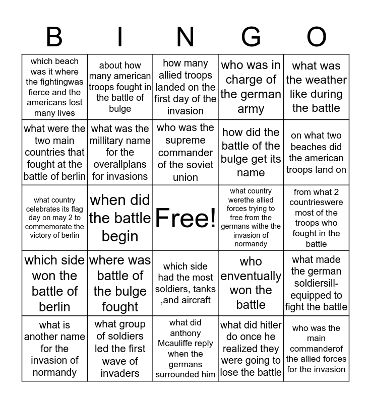 This bingo card has a free space and 24 words: where was battle of the bulge fought, what group of soldiers led the first wave of invaders, who was the supreme commander of the soviet union, what is another name for the invasion of normandy, what was the weather like during the battle, which beach was it where the fightingwas fierce and the americans lost many lives, what were the two main countries that fought at the battle of berlin, about how many american troops fought in the battle of bulge, what country werethe allied forces trying to free from the germans withe the invasion of normandy, which side had the most soldiers, tanks ,and aircraft, how did the battle of the bulge get its name, what country celebrates its flag day on may 2 to commemorate the victory of berlin, who enventually won the battle, what made the german soldiersill-equipped to fight the battle, what was the millitary name for the overallplans for invasions, what did hitler do once he realized they were going to lose the battle, from what 2 countrieswere most of the troops who fought in the battle, how many allied troops landed on the first day of the invasion, on what two beaches did the american troops land on, when did the battle begin, who was the main commanderof the allied forces for the invasion, which side won the battle of berlin, who was in charge of the german army and what did anthony Mcauliffe reply when the germans surrounded him.