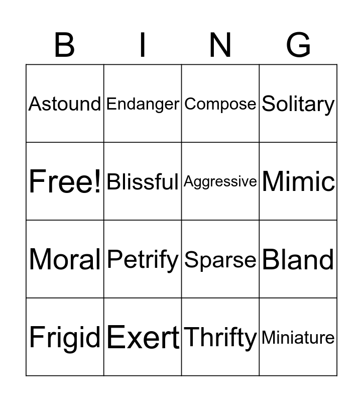 This bingo card has 16 words: Exert, Bland, Compose, Astound, Moral, Endanger, Sparse, Thrifty, Free!, Blissful, Frigid, Solitary, Petrify, Mimic, Aggressive and Miniature.