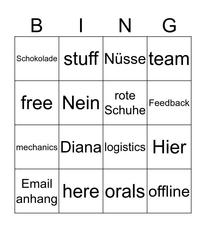 This bingo card has 16 words: here, Hier, Nüsse, Schokolade, mechanics, stuff, logistics, orals, free, Nein, Email anhang, team, Diana, Feedback, rote Schuhe and offline.