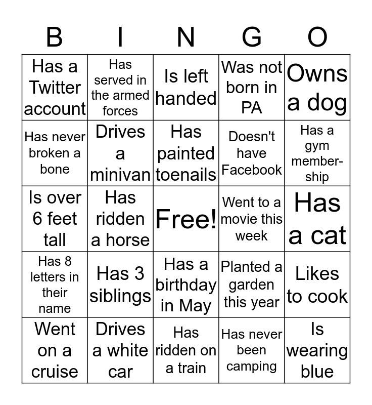 This bingo card has a free space and 24 words: Has 3 siblings, Drives a white car, Has painted toenails, Went on a cruise, Owns a dog, Has a Twitter account, Has never broken a bone, Has served in the armed forces, Went to a movie this week, Has a birthday in May, Doesn't have Facebook, Is over 6 feet tall, Planted a garden this year, Likes to cook, Drives a minivan, Has never been camping, Has a cat, Is left handed, Has a gym member- ship, Has ridden a horse, Is wearing blue, Has 8 letters in their name, Was not born in PA and Has ridden on a train.