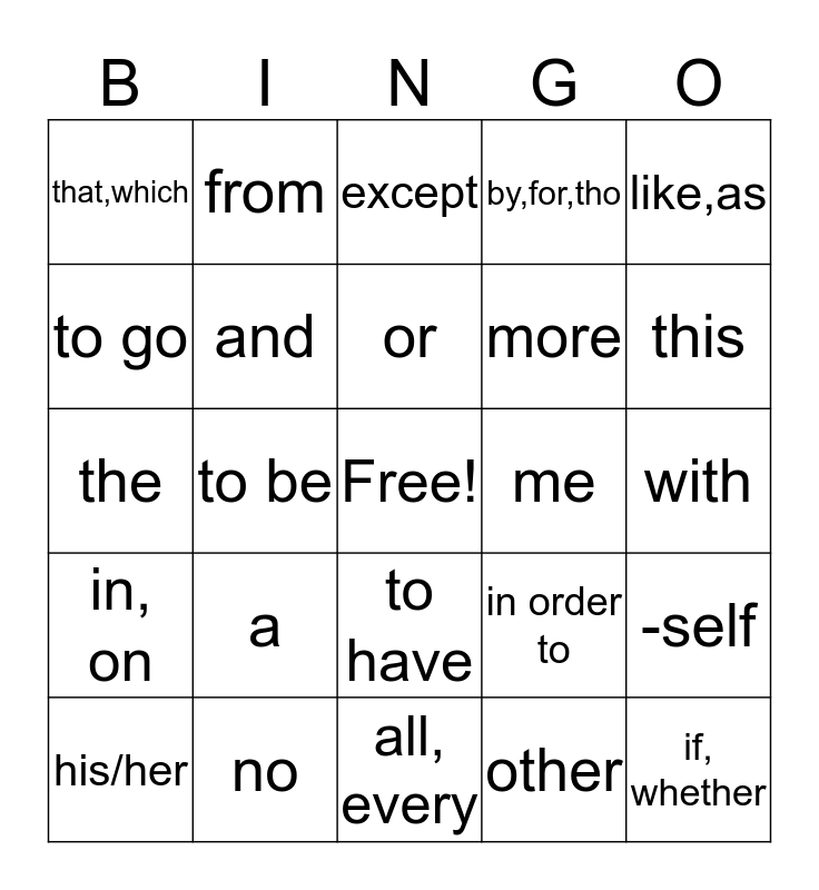 This bingo card has a free space and 24 words: a, no, or, his/her, like,as, that,which, to go, from, me, to have, more, the, in order to, -self, and, other, with, except, this, to be, if, whether, in, on, by,for,tho and all, every.