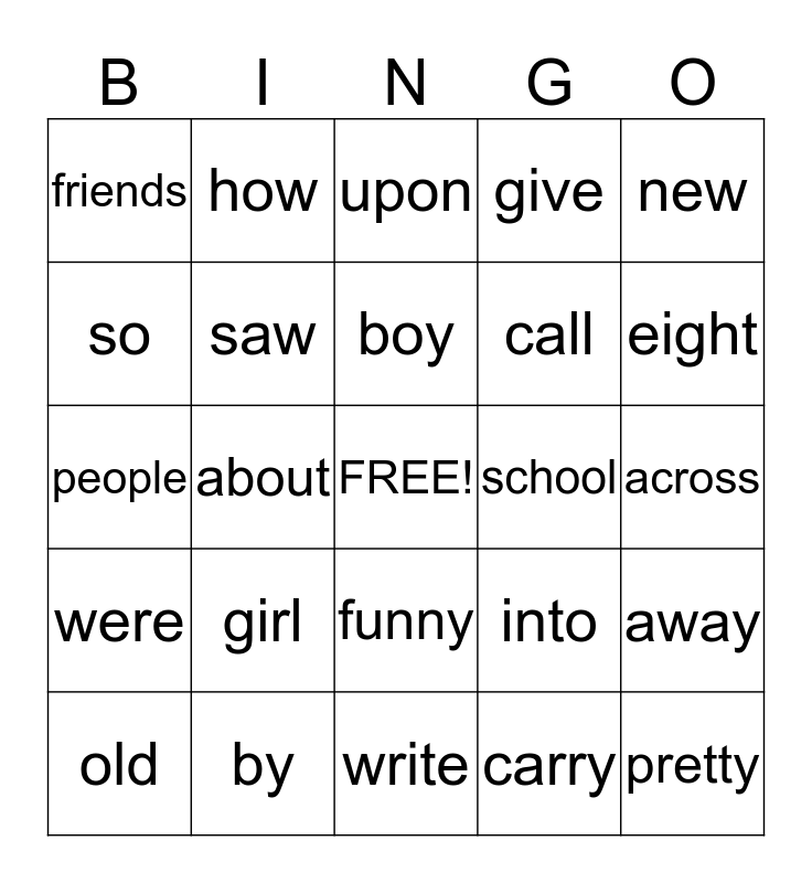 This bingo card has a free space and 24 words: girl, by, boy, old, new, friends, so, how, school, funny, call, people, into, away, saw, carry, across, upon, eight, about, pretty, were, give and write.