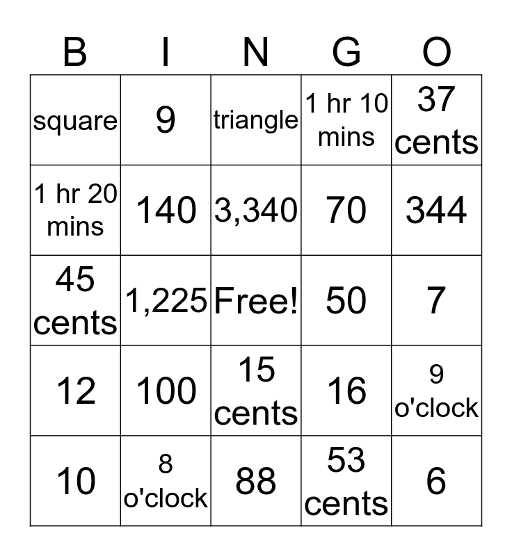 This bingo card has a free space and 24 words: 100, 8 o'clock, 3,340, 10, 37 cents, square, 1 hr 20 mins, 9, 50, 15 cents, 70, 45 cents, 16, 9 o'clock, 140, 53 cents, 7, triangle, 344, 1,225, 6, 12, 1 hr 10 mins and 88.