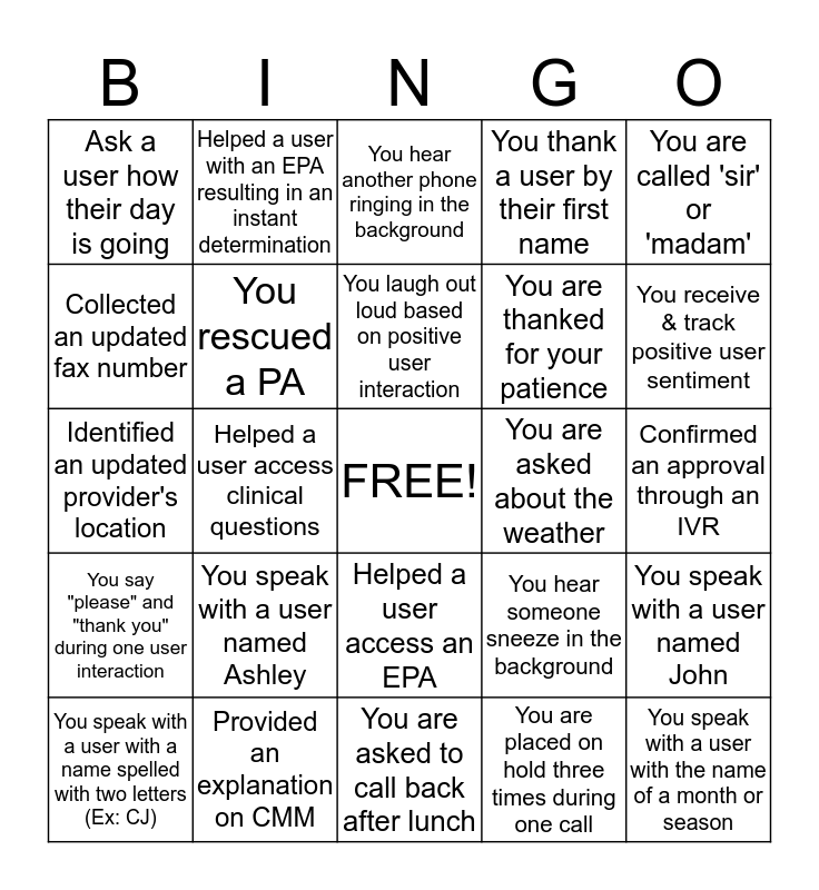 This bingo card has a free space and 24 words: You speak with a user named Ashley, Provided an explanation on CMM, You laugh out loud based on positive user interaction, You speak with a user with a name spelled with two letters (Ex: CJ), You are called 'sir' or 'madam', Ask a user how their day is going, Collected an updated fax number, Helped a user with an EPA resulting in an instant determination, You are asked about the weather, Helped a user access an EPA, You are thanked for your patience, Identified an updated provider's location, You hear someone sneeze in the background, You speak with a user named John, You rescued a PA, You are placed on hold three times during one call, Confirmed an approval through an IVR, You hear another phone ringing in the background, You receive & track positive user sentiment, Helped a user access clinical questions, You speak with a user with the name of a month or season, You say "please" and "thank you" during one user interaction, You thank a user by their first name and You are asked to call back after lunch.