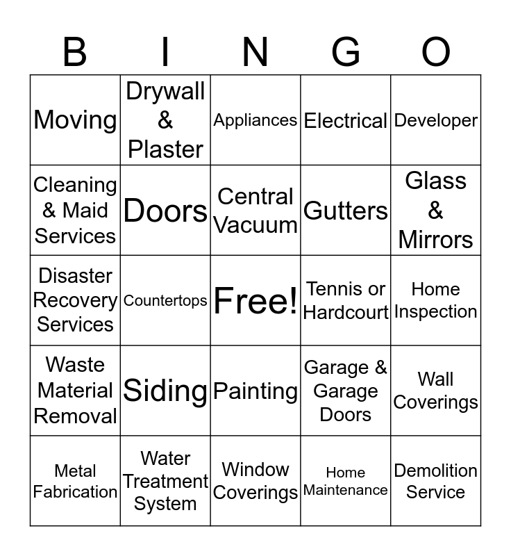 This bingo card has a free space and 76 words: A/C & Cooling Systems, Additions & Remodeling, Appliances, Appraiser, Architects & Engineers, Audio/Visual & Computers, Awnings, Brick & Stone, Cabinets, Carpenters, Carpet & Upholstery Cleaning, Ceilings, Central Vacuum, Cleaning & Maid Services, Concrete, Countertops, Decks, Demolition Service, Designers & Decorators, Developer, Disability Services, Disaster Recovery Services, Doors, Drywall & Plaster, Electrical, Excavation, Fans, Fences, Fireplace & Wood Stoves, Flooring & Carpet, Foundations, Fountains & Ponds, Furniture Repair & Refinish, Garage & Garage Doors, Glass & Mirrors, Gutters, Handyman, Heating & Furnace Systems, Home Inspection, Home Maintenance, Home Security Services, Hot Tubes, Spas & Saunas, Insulation, Landscaping Design, Lawn & Garden Care, Locksmith, Metal Fabrication, Moving, New Home Builders, Organizers, Outdoor Playgrounds, Painting, Paving, Pest Control, Plumbing, Rental Services, Roofing, Sandblasting Service, Septic Tanks & Wells, Sheds & Enclosures, Siding, Skylights, Snow Removal, Solar, Stained Glass, Swimming Pools, Tennis or Hardcourt, Testing & Abatement Services, Tile, Tree Service, Wall Coverings, Waste Material Removal, Water Treatment System, Waterproofing, Window Coverings and Windows.