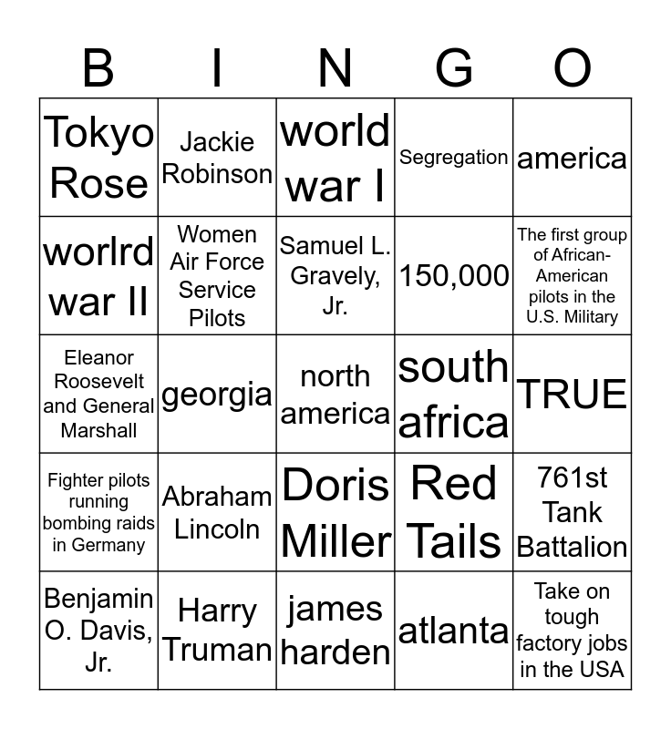 This bingo card has a free space and 24 words: Abraham Lincoln, Harry Truman, Samuel L. Gravely, Jr., Benjamin O. Davis, Jr., america, Tokyo Rose, worlrd war II, Jackie Robinson, south africa, Doris Miller, 150,000, Eleanor Roosevelt and General Marshall, Red Tails, 761st Tank Battalion, Women Air Force Service Pilots, atlanta, TRUE, world war I, The first group of African-American pilots in the U.S. Military, georgia, Take on tough factory jobs in the USA, Fighter pilots running bombing raids in Germany, Segregation and james harden.