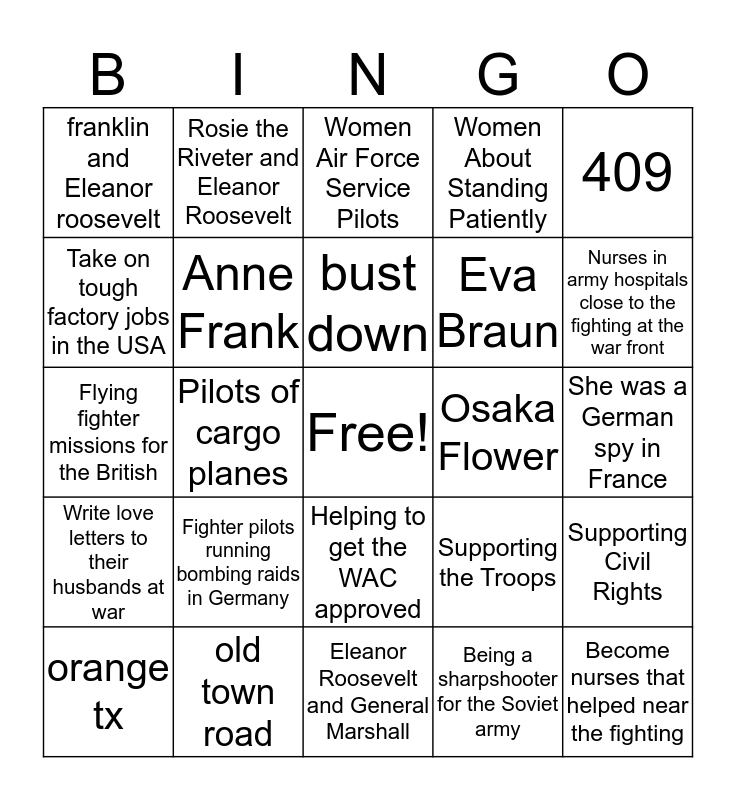 This bingo card has a free space and 24 words: Fighter pilots running bombing raids in Germany, old town road, bust down, orange tx, 409, franklin and Eleanor roosevelt, Take on tough factory jobs in the USA, Rosie the Riveter and Eleanor Roosevelt, Osaka Flower, Helping to get the WAC approved, Eva Braun, Flying fighter missions for the British, Supporting the Troops, Supporting Civil Rights, Anne Frank, Being a sharpshooter for the Soviet army, She was a German spy in France, Women Air Force Service Pilots, Nurses in army hospitals close to the fighting at the war front, Pilots of cargo planes, Become nurses that helped near the fighting, Write love letters to their husbands at war, Women About Standing Patiently and Eleanor Roosevelt and General Marshall.