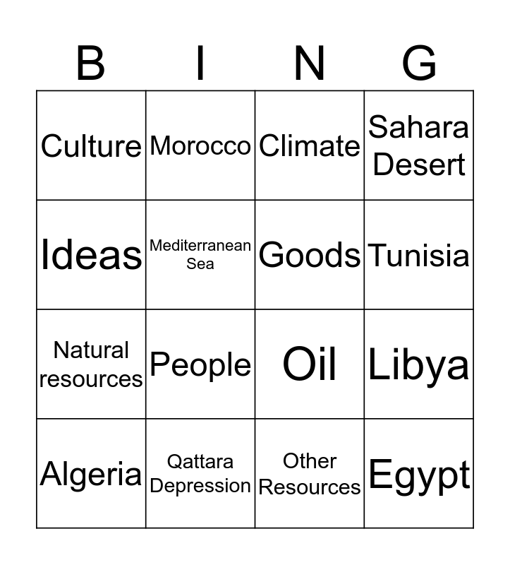This bingo card has 20 words: Libya, Gas, Climate, Atlas Mountains, Algeria, Ideas, Qattara Depression, Culture, Natural resources, Morocco, People, Oil, Mediterranean Sea, Egypt, Goods, North Africa, Tunisia, Sahara Desert, Other Resources and Nile River.
