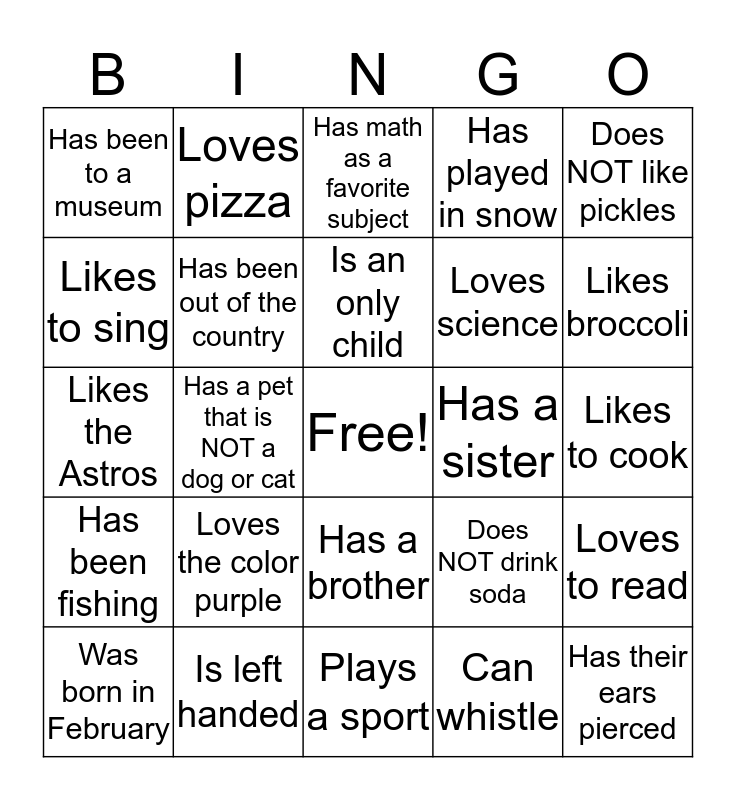 This bingo card has a free space and 25 words: Loves the color purple, Plays a sport, Is an only child, Was born in February, Does NOT like pickles, Has been to a museum, Likes to sing, Loves pizza, Has a sister, Has a brother, Loves science, Likes the Astros, Does NOT drink soda, Loves to read, Has been out of the country, Plays an instrument, Likes to cook, Has math as a favorite subject, Likes broccoli, Has a pet that is NOT a dog or cat, Has their ears pierced, Is left handed, Has been fishing, Has played in snow and Can whistle.