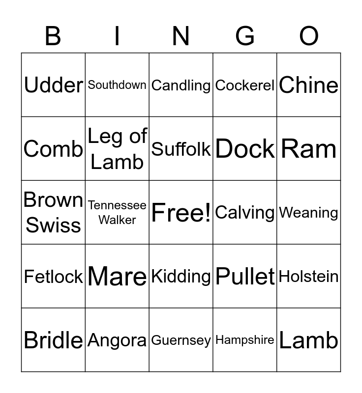 This bingo card has a free space and 99 words: Palomino, Bull, Clippers, Candling, Herd (Goat), Racing, Jersey, Ewe, Beak, Kid, Gaskin, Bulk Tank, New Hampshire, Kidding, Gelding, Udder, Southdown, Rooster, Bleat, Neigh, Cow, Baaa, Cluck, Mohair, Arabian, Holstein, Suffolk, Leghorn, Alpine, Through-bred, Guernsey, Hampshire, Cornish, Saanen, Tennessee Walker, Brown Swiss, Columbia, Buff Cochin, Nubian, Mare, Steer, Ram, Cockerel, Angora, Stallion, Heifer, Wether (Sheep), Hen, Buck, Colt, Calf, Lamb, Pullet, Doe, Filly, Milk, Gummer, Chick, Wether (Goat), Foal, Ice Cream, Wool, Eggs, Doeling, Riding, Chine, Lamb, Poultry, Cheese, Fetlock, Crop, Dock, Comb, Yogurt, Mane, Herd (Dairy Cow), Leg of Lamb, Hackle, Thurl, Herd (Horse), Calving, Loin (Lamb), Flock (Chicken), Loin (Goat), Foaling, Milking Machine, Flock (Sheep), Hatching, Weaning, Bridle, Mooo, Wool Card, Roost, Twins, Bit, Halter, Lambing Pen, Nest and Alpine.
