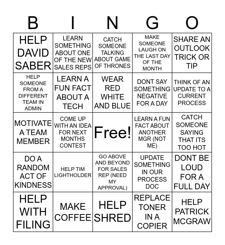 This bingo card has a free space and 24 words: HELP TIM LIGHTHOLDER, MAKE COFFEE, WEAR RED WHITE AND BLUE, HELP WITH FILING, SHARE AN OUTLOOK TRICK OR TIP, HELP DAVID SABER, HELP SOMEONE FROM A DIFFERENT TEAM IN ADMIN, LEARN SOMETHING ABOUT ONE OF THE NEW SALES REPS, LEARN A FUN FACT ABOUT ANOTHER MGR (NOT ME), GO ABOVE AND BEYOND FOR SALES REP (NEED MY APPROVAL), DONT SAY SOMETHING NEGATIVE FOR A DAY, MOTIVATE A TEAM MEMBER, UPDATE SOMETHING IN OUR PROCESS DOC, DONT BE LOUD FOR A FULL DAY, LEARN A FUN FACT ABOUT A TECH, REPLACE TONER IN A COPIER, CATCH SOMEONE SAYING THAT ITS TOO HOT, CATCH SOMEONE TALKING ABOUT GAME OF THRONES, THINK OF AN UPDATE TO A CURRENT PROCESS, COME UP WITH AN IDEA FOR NEXT MONTHS CONTEST, HELP PATRICK MCGRAW, DO A RANDOM ACT OF KINDNESS, MAKE SOMEONE LAUGH ON THE LAST DAY OF THE MONTH and HELP SHRED.