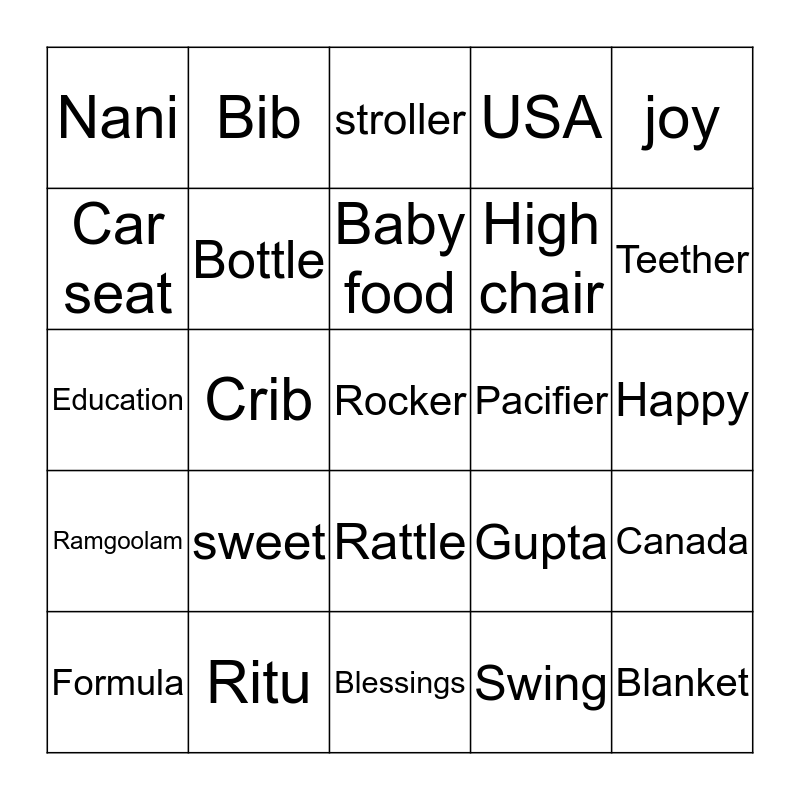 This bingo card has 30 words: Ritu, Randy, Crib, Nana, Nani, stroller, Bottle, Rattle, Pacifier, Blessings, Happy, Rocker, Swing, Blanket, Teether, Lots of work, Gupta, Ramgoolam, sweet, joy, Education, Diapers, Bib, High chair, Car seat, USA, Canada, Formula, Baby food and Teddy bear.